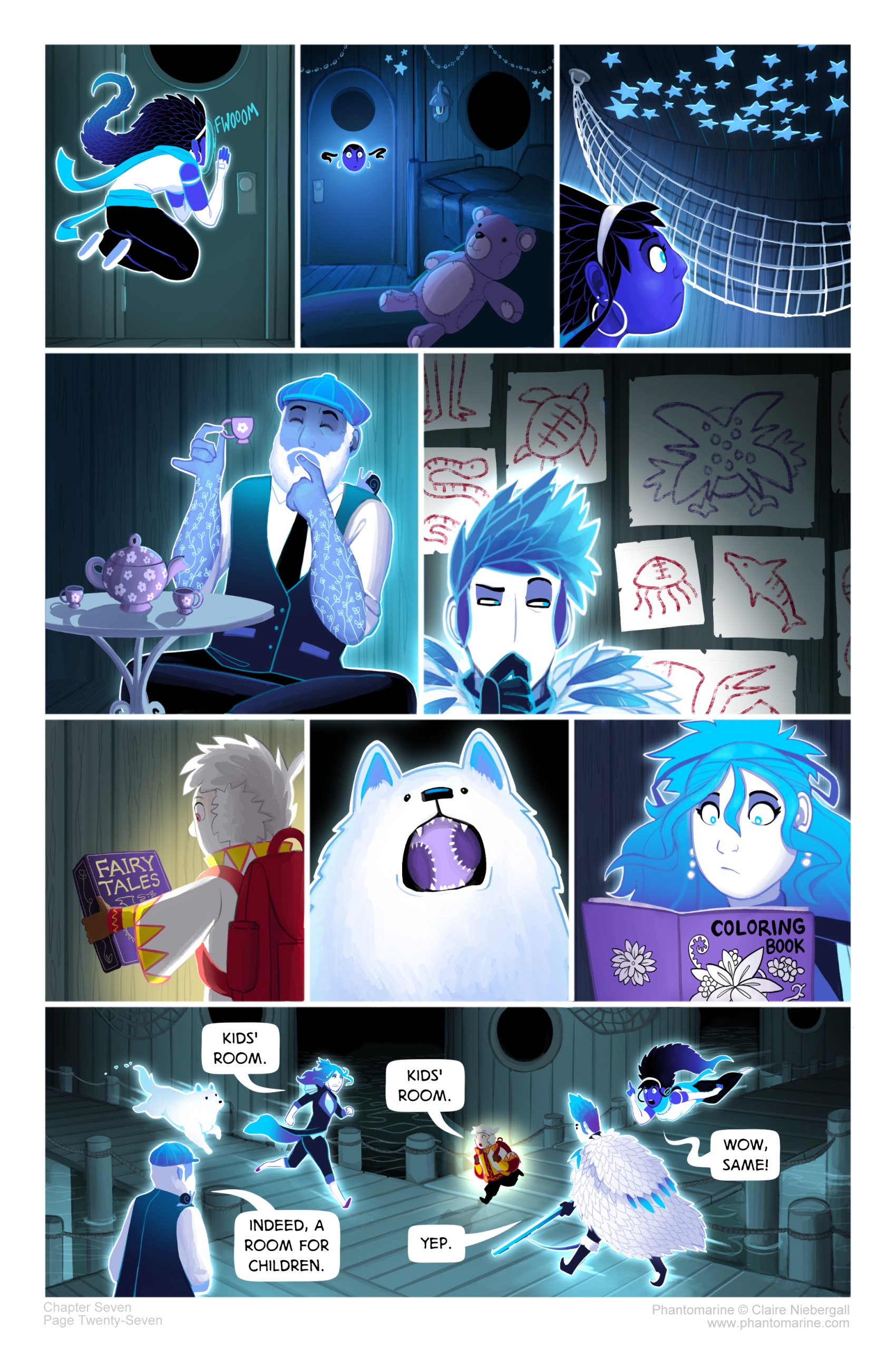 Lani makes her way to a door, and sticks her face through the wood under the round window with a FWOOM. She looks inside, her glow illuminating the space. There are no people inside - there are beds, and one bed has a purple teddy bear on it. Up on the ceiling there is a hammock, and there are glow-in-the-dark stars on the walls and ceiling.